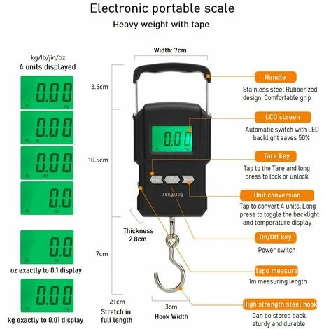 La báscula corporal electrónica tiene una gran pantalla LCD digital que es tanto una báscula de precisión para uso doméstico como para deportes al aire libre como la pesca, los viajes y las compras. Con una función de tara y bloqueo de datos, la unidad de peso se puede cambiar fácilmente entre lb/kg/oz, el gancho de acero inoxidable resistente y la función de parada automática. Después de 120 segundos, ahorra energía y la batería dura más.