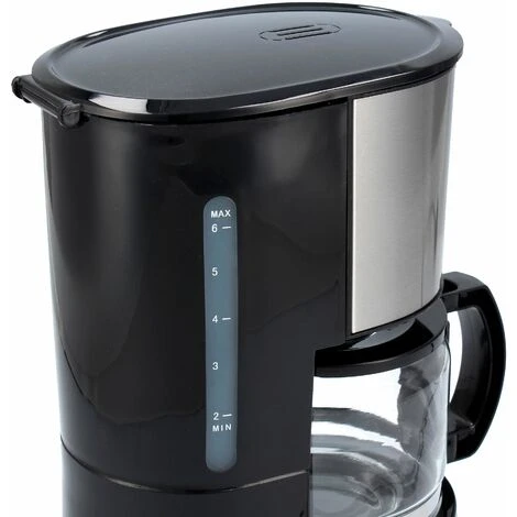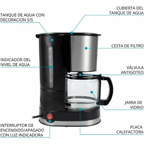 Cafetera eléctrica de goteo con 600W de potencia y con una capacidad de hasta 6 tazas gracias a su jarra de 0,6L. de capacidad para que siempre tengas listo tu café recién hecho en pocos minutos. El tanque de agua viene graduado en función de las jarras de café que quieras preparar de forma que no te quedes corto de agua o se quede con poco sabor al tener demasiada agua. Muy fácil y segura de usar gracias a su interruptor de encendido / apagado con luz indicadora para con la que saber si la cafetera está encendida. Además, incluye un sistema de apagado automático pasados 40 minutos. Su sistema anti goteo es muy práctico a la hora de servir café de la jarra cuando aún esta se encuentra funcionando, cortando el flujo del goteo para reanudarlo una vez puesta la jarra de nuevo. Tu café siempre a su temperatura ideal en su jarra de vidrio gracias a la placa de calentamiento con revestimiento antiadherente que lo mantiene caliente. El filtro para el café molido es extraíble por lo que es muy sencillo y rápido de limpiar después de cada uso y sustituible por los clásicos filtros de papel. Los pies antideslizantes fabricados en goma le confieren una estabilidad adicional a la cafetera para evitar cualquier tipo de situaciones desagradables.