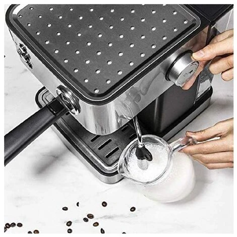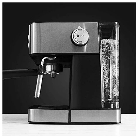 Cafetera express para café espresso y cappuccino, con 20 bares, manómetro y vaporizador orientable. Cafetera express para café espresso y cappuccino de 850 W. Bomba italiana de presión con tecnología ForceAroma de 20 bares que consigue la mejor crema y el máximo aroma. Manómetro de control Pressure Pro para comprobar la presión en tiempo real. Incluye vaporizador orientable con protección para el uso, para espumar leche, emitir agua caliente para infusiones, calentar líquidos y preparar cappuccinos. Brazo portafiltros con doble salida y dos filtros para preparar uno o dos cafés a la vez. Depósito de agua extraíble con 1,5 litros de capacidad. Con bandeja calientatazas de acero inoxidable. Incluye cucharilla dosificadora con prensador para el café. Bandeja de goteo desmontable para facilitar la limpieza. Sistema de ahorro energético con apagado automático y stand-by. Indicadores luminosos en cada función. Composición: Cafetera express Filtro individual para un café Filtro para dos cafés Cuchara medidora y prensa Brazo portafiltros Manual de instrucciones
