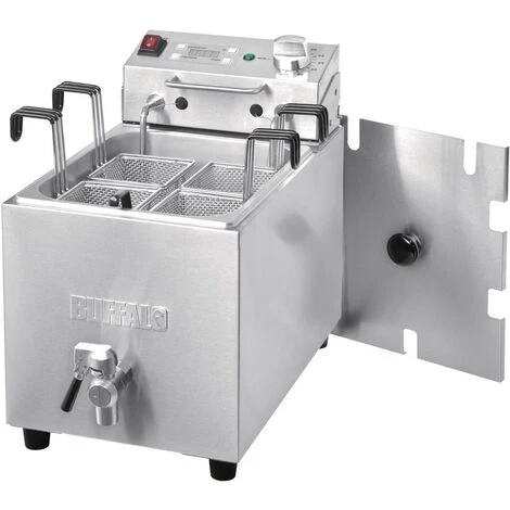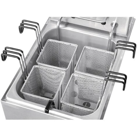 Cuece pasta eléctrico fabricado en resistente acero inoxidable. Admite cuatro cestas para cocinar raciones de pasta independientes. Dispone de temporizador para cocinar la pasta al punto perfecto. Incluye interruptor de rearme y corte térmico de seguridad. Incorpora un control de temperatura de ruleta con rango de temperatura de 25ºC a 100ºC y botón luminoso de encendido o apagado. El cabezal es abatible y su grifo de vaciado permite limpiar fácilmente el cocedor de pasta. Incluye tapa para mantener tapado cuando no se está usando evitando así posibles contaminaciones cruzadas. Las cestas son de acero inoxidable. La cuba admite hasta 8 litros de agua.