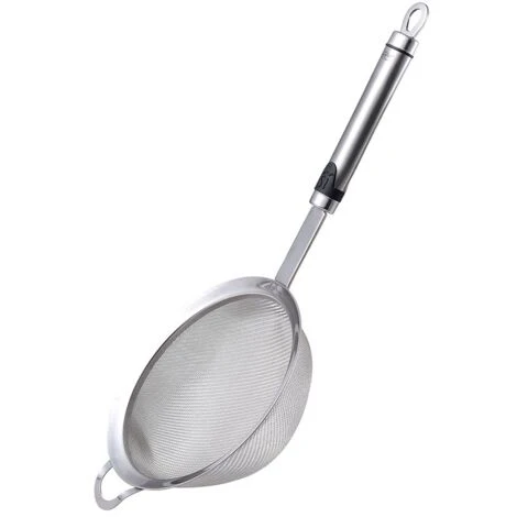 Colador 34x16cm acero inox. expert sg7339 san ignacio. colador de cocina de tamaño grande. su gran tamaño, de 34x16cm, hace posible utilizarlo para escurrir grandes cantidades de pasta o colar gazpachos, por ejemplo. tamizador de harina de diseño ergonómico. puede manipularse con total comodidad gracias a su mango de varilla de acero. no se resbalará ni cederá bajo el peso de los alimentos, ya que este acero es prácticamente indeformable. escurridor de cocina en acero inoxidable. sus materiales hacen de este producto un accesorio de cocina resistente a los impactos y las altas temperaturas, además de inoxidable. todo ello lo dota de una gran durabilidad. con una anilla para colgar. este colador puede almacenarse fácilmente gracias a la anilla al final de su mango, que hace posible colgarlo. no ocupará espacio en los cajones de la cocina. un escurridor muy versátil. tanto sus materiales como su diseño lo hacen óptimo para todo tipo de trabajos en la cocina. el tamaño de su rejilla lo hace apto tanto para colar como para tamizar o escurrir.