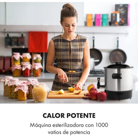 El manejo es muy sencillo: apilar tarros llenos en la olla programable, verter agua, seleccionar la temperatura de ebullición necesaria entre 30 y 100 °C y listo. La olla mantiene automáticamente la temperatura seleccionada, mientras que la protección contra sobrecalentamiento vela por la seguridad durante la cocción y apaga la olla si esta se sobrecalienta o funciona vacía.