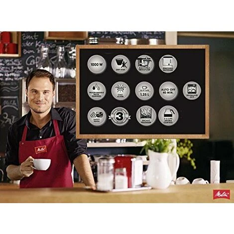 Melitta Aroma Elegance. Diseño: Independiente, Color del producto: Acero inoxidable, Tecnología de elaboración de café: Goteo. Café tipo de entrada: De café molido, Tipos de bebida: Café, Capacidad de reservorio de agua: 1,25L. Ancho: 37,5 cm, Profundidad: 25,5 cm, Altura: 36 cm