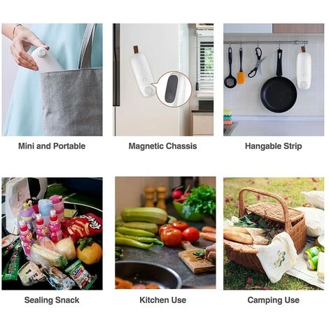 【Mini & 【Portátil】Mini sellador de alimentos Con una tira para colgar y la tira magnética en la parte posterior, puede colgarlo en la pared, detrás de la puerta o pegarlo en el refrigerador para ahorrar espacio. También puedes ponerlo en tu mochila para acampar, ir de excursión, pescar o de vacaciones.