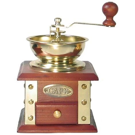 Molinillo de café decorativo en madera y chapa dorada con accionamiento a manivela.