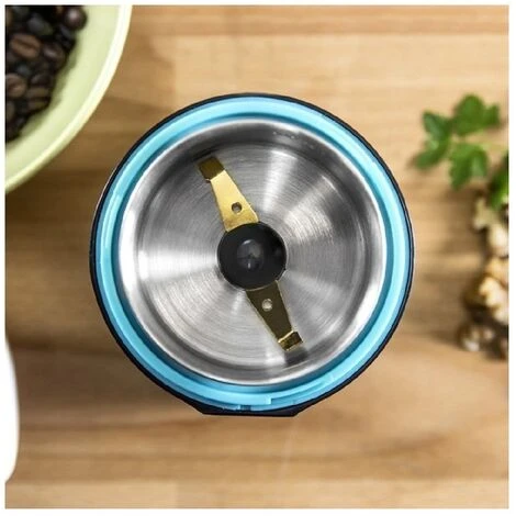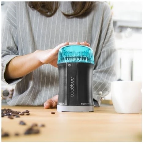 Molinillo compacto para café y especias de 200 W con cuchillas con recubrimiento de titanio. Molinillo compacto para café, especias y otros alimentos. Cuchillas con recubrimiento de titanio que mejora la dureza y mantiene el afilado por más tiempo. Molido más eficiente, fino y rápido gracias a sus 200 W de potencia. Puede moler el depósito entero de café en 30 segundos. 50 g de capacidad, equivalente a 10 tazas de café. Recipiente de acero cepillado fácil de limpiar. BPA-free plásticos libres de tóxicos. Composición: Molinillo Tapa Manual de instrucciones