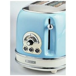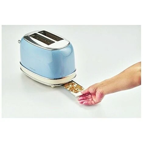 Guías para centrar el pan. Bandeja recogemigas extraíble. Paredes frías para una mayor seguridad. Pies antideslizantes. Recogecable. Tostador de metal color azul.
