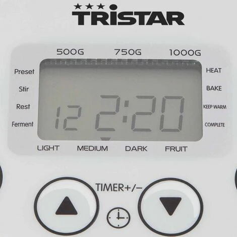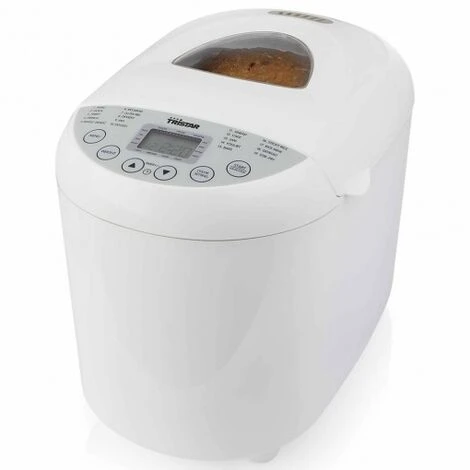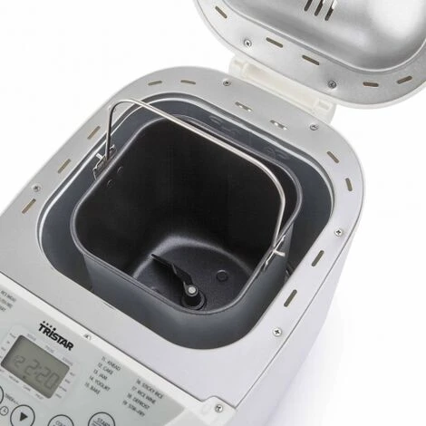 Panificadora 1 kg 19 programas BM4586.-Panificadora con programa sin gluten 550W Tristar BM 4586.-Con la panificadora Tristar BM4586 siempre podrá disfrutar de un delicioso pan recién hecho.-Gracias a los 19 programas de horneado preconfigurados, podrá dejar que la panificadora haga todo el trabajo-Puede seleccionar el programa sin gluten especial, y también puede decidir cómo de tostada quiere la corteza del pan.-La panificadora Tristar BM4586 le quitará todo el trabajo.-Gracias a los 19 diferentes programas de horneado, no solo elaborará el pan recién hecho más delicioso, sino que también podrá preparar mermelada, yogurt, arroz y masa.-Además, dispone de un programa rápido y un programa sin gluten.-Podrá decidir si prefiere la corteza de color claro, mediano u oscuro.-La panificadora dispone de un gancho para amasar, por lo que solo deberá añadir los ingredientes y la máquina hará el resto.-inalizada la cocción, mantiene automáticamente el pan caliente durante una hora, gracias a la función de conservación del calor.-El temporizador también permite despertar con un pan recién hecho: solo deberá añadir los ingredientes, ajustar el temporizador y tendrá el pan listo con el mínimo esfuerzo.-Una ventaja adicional de elaborar su propio pan es que no contendrá aditivos perjudiciales y que sabrá exactamente qué ingredientes contiene.-Además, el pan resulta más económico porque puede elegir usted los ingredientes.-La panificadora Tristar BM4586 dispone de una pantalla LCD con temporizador y panel de control digitales.-Permiten configurar la panificadora fácilmente según sus preferencias.-La panificadora es muy fácil de limpiar porque el molde extraíble con recubrimiento antiadherente se puede lavar en el lavavajillas.-Dosificar los ingredientes resulta sencillo con el medidor y la cuchara incluidos.-La tapa de la panificadora es flexible.-Por ello, no tendrá que preocuparse si la masa sube demasiado, porque la tapa se abrirá.-La panificadora Tristar BM4586 tiene una capacidad máxima de 1000 g, pero puede preparar cantidades menores.-La ventana del visor en la tapa le permite ver el proceso de horneado.-Potencia: 550 W.