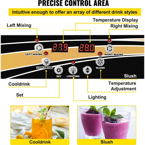 - 【ÁREA DE CONTROL PRECISO】- El panel de control breve está equipado en la máquina. Cada recipiente funciona independientemente y se puede encender / apagar o entre los modos de bebida fría y aguanieve. Diseñado con la función de conservación, puede establecer la temperatura de 26,6 °F a 28,4 °F (-3~-2 ℃ ) para mantener frescos los granizados.
